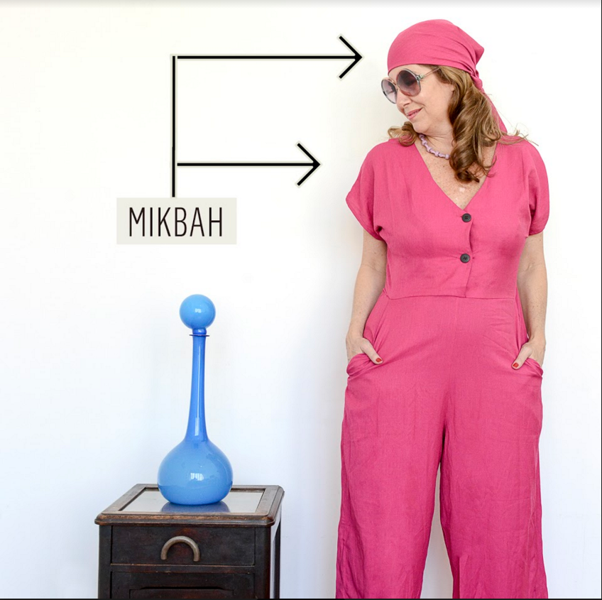 Mikbah – @mikbah – marca carioca super slow fashion, tão slow que produz as peças no tamanho da cliente, caso a grade disponível na loja não funcione, e produz peças sob demanda. Como por exemplo o lenço que está na  minha cabeça e é da cor do macacão.