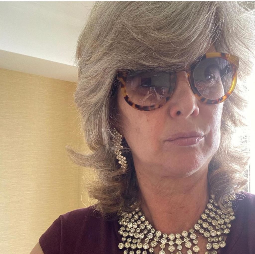 O cabelão cheio e poderoso, de leonina, está recentemente grisalho, assumido: sua marca registrada, além do humor e inteligência pra lá de deliciosos! Tá linda!