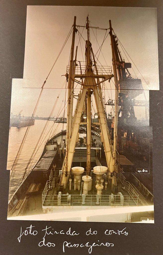 Embarquei. E a primeira coisa que fiz foi tirar fotos da proa do navio, vista do pequeno convés reservado para nós, os poucos passageiros. Tive que tirar três fotos, torcer para que estivessem mais ou menos enquadradas de forma que pudesse montá-las depois de reveladas, para conseguir ter proa e mastros numa só imagem. Acho que nem ficou tão mal, veja a foto aqui. Coisas da fotografia antiga.