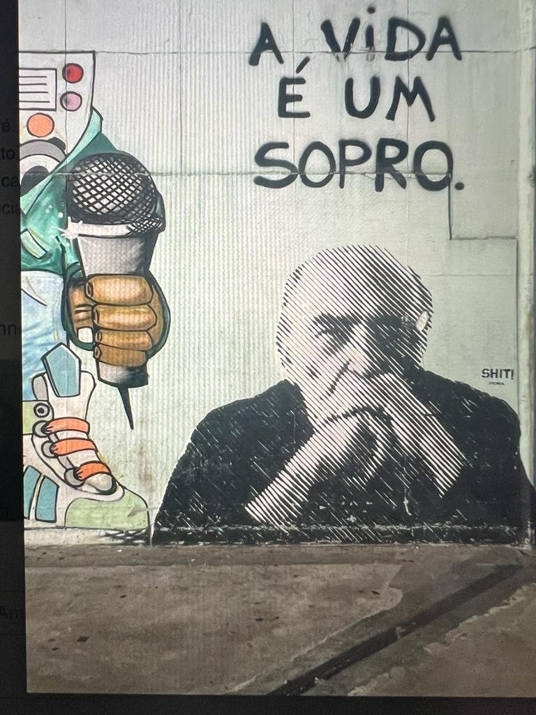 Bem, cheguei ao Mineirão com uma bateria de escola de samba no peito, cada etapa passada dava mais frio na barriga. Caminhando ao redor do estádio, me deparo com um grafite do Niemeyer com os escritos “A vida é um sopro”. Entro no estádio e tem uma imagem enorme dele e da Gal abraçados, num abraço tão terno, tão genuíno.