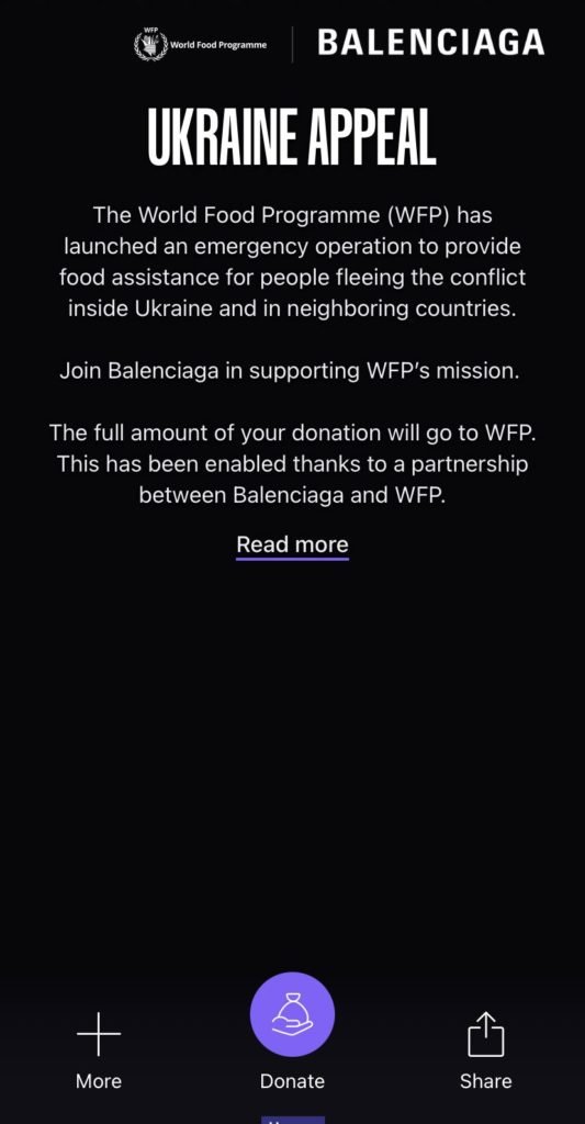 Balenciaga durante a Paris Fashion Week. Em plena semana de moda, a marca simplesmente arquivou todas as suas postagens e stories da sua conta no Instagram, deixando apenas um post com a bandeira da Ucrânia e a sua iniciativa de ajudar nesse cenário tão devastador. Para quem tiver interesse, maiores informações sobre o projeto da marca estão na bio do perfil.