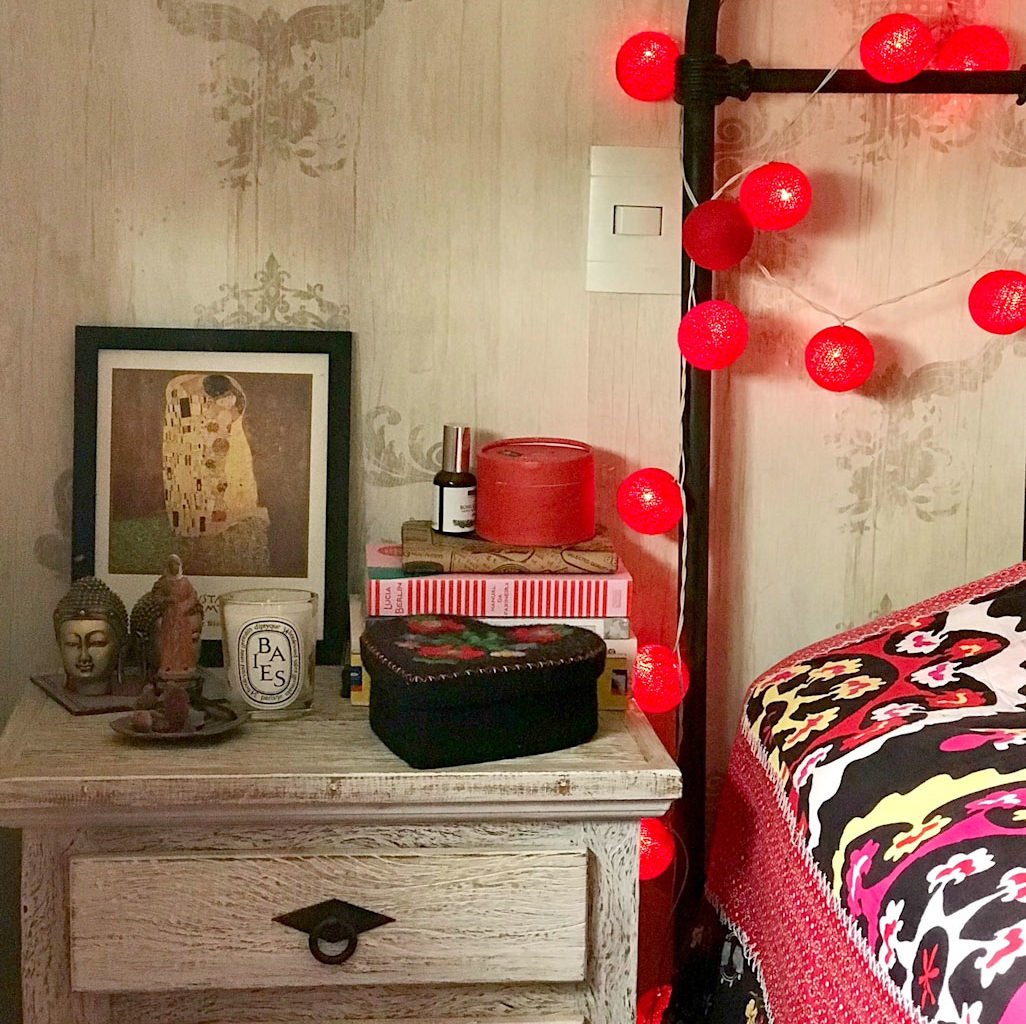 Alguns objetos místicos como Buda, incensos, e uma imagem de Nhá Chica; oferecem ao ambiente um clima leve e proteção. Para acalentar a noite, lanternas vermelhas dispostas de forma despojada enfeitavam a cabeceira da cama…