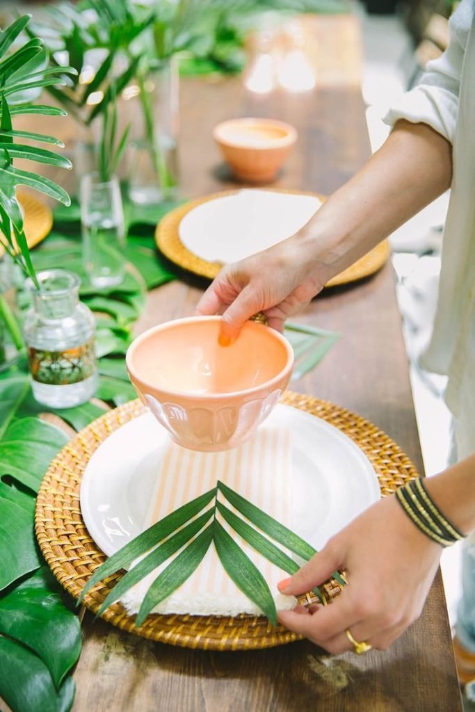 Louças coloridas: Mix and match na hora de servir à mesa. Misture copos coloridos e pratos diferentes. Você pode por exemplo decorar a mesa com sobreposição de folhas de costela-de-adão (como se fosse jogo americano), ou ainda; colocar galhinhos de lavanda e alecrim sobre os guardanapos, fica tão delicado…Encontrei louças e copos bem legais na Camicado.