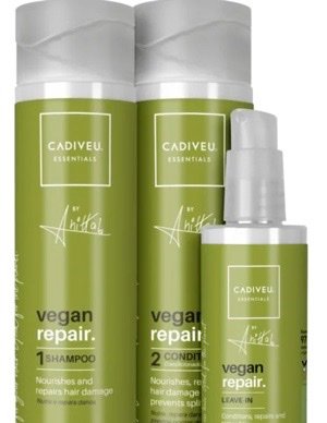 Cadiveu Essentials Anitta Vegan Repair, xampu, máscara e leave-in – combinam óleos de crambe, de girassol e de abacate, que nutrem e selam as escamas dos fios.