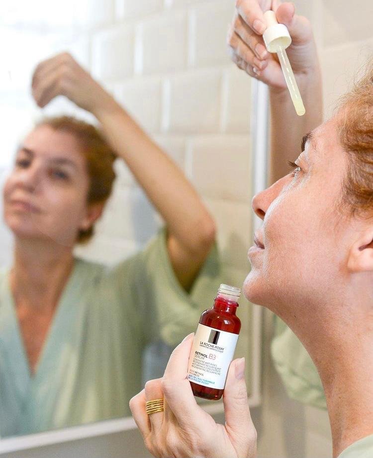 Noite: aplico Mineral 89 da Vichy, no entorno dos olhos uso A-Oxitive da Avène e no rosto o Retinol B3 da Lo Roche-Posay. No colo, passo o Ivy C da Mantecorp.